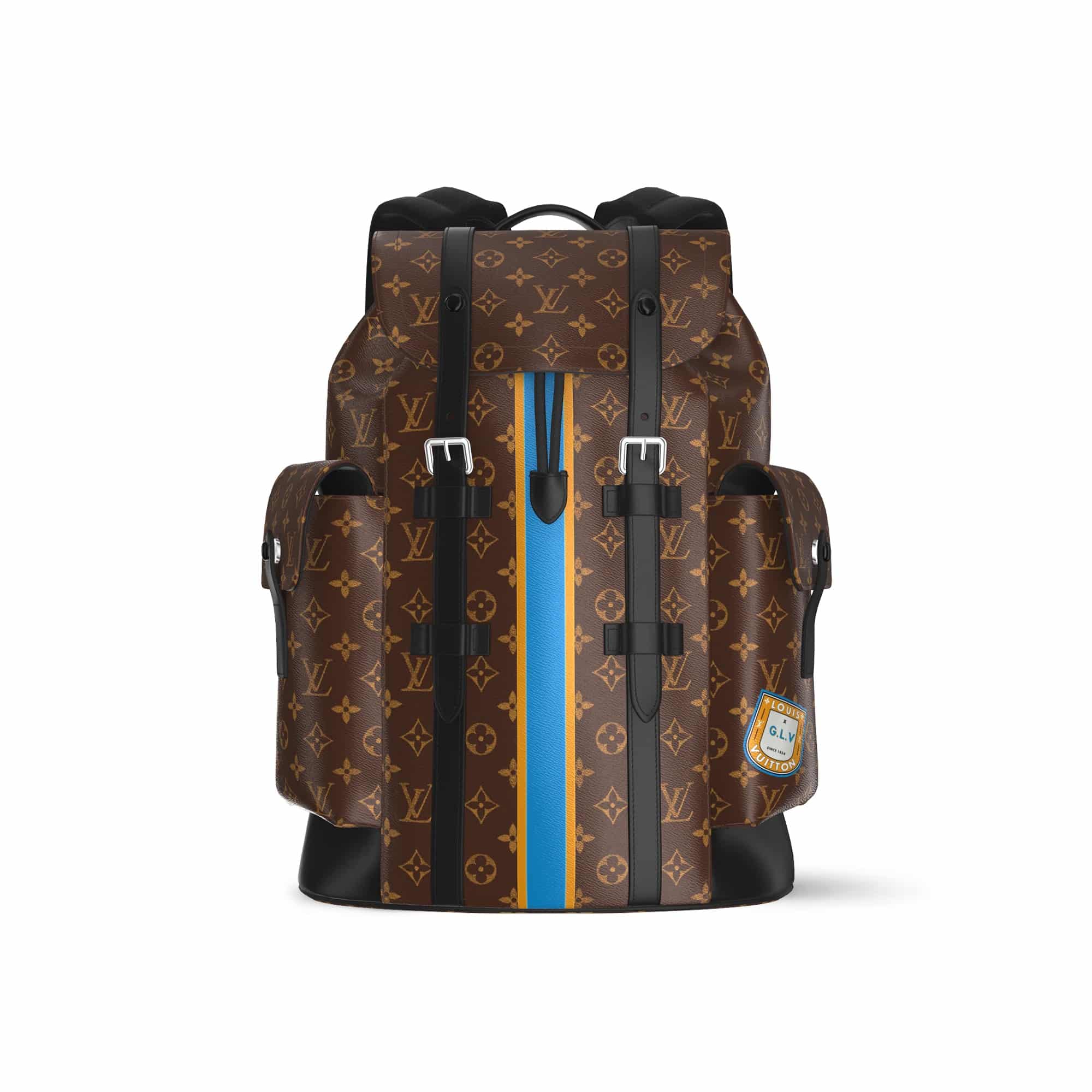 The Christopher MM is a mid-sized backpack made from Monogram canvas with cowhide leather trim. It features adjustable shoulder straps, a top handle, and a flap opening with press-stud and drawstring closure. The bag includes two side pockets and several interior compartments, including a tablet pocket, a zipped pocket, and two flat pockets. The interior is lined with textile, and the metallic pieces are silver-colored.