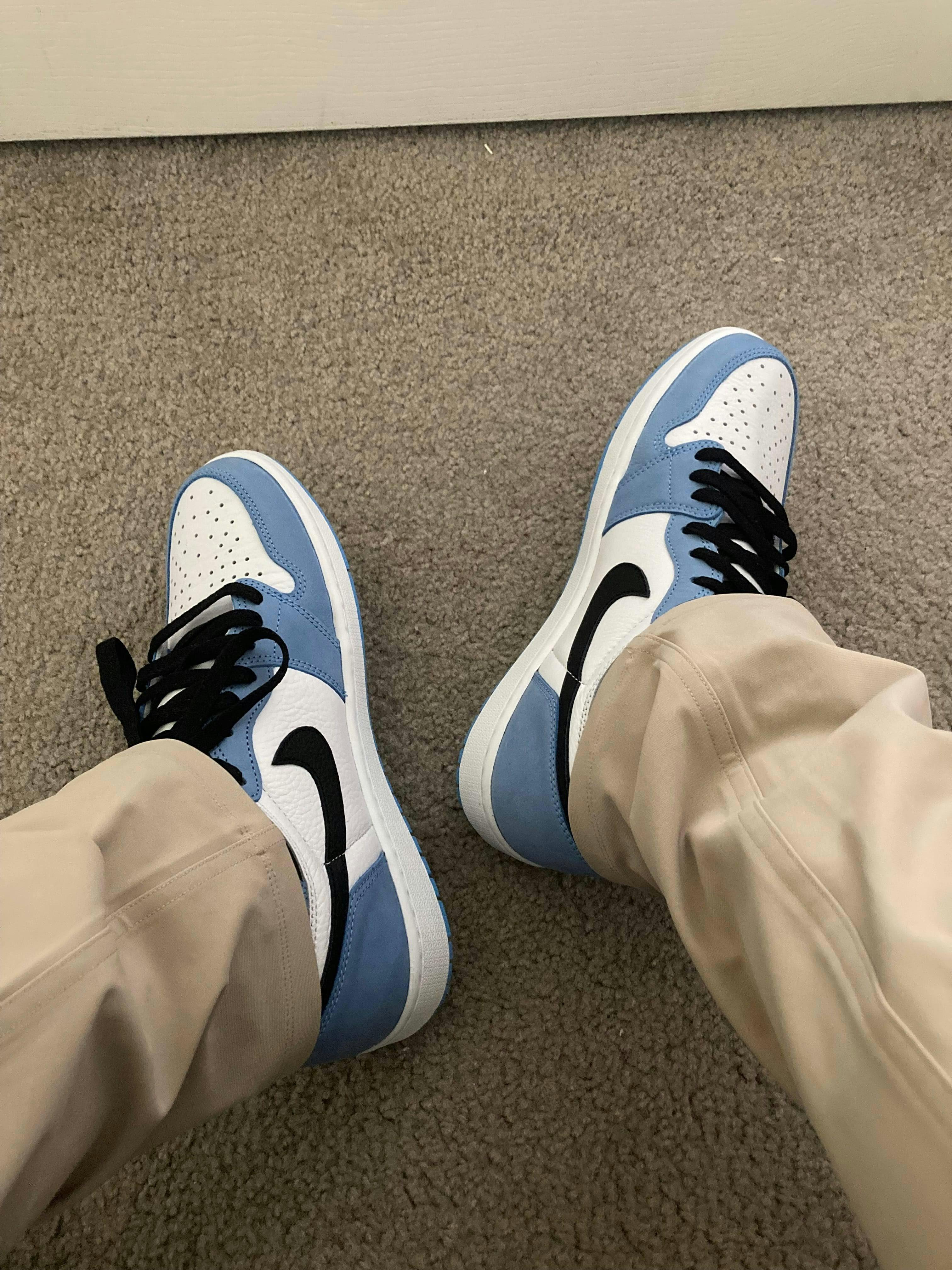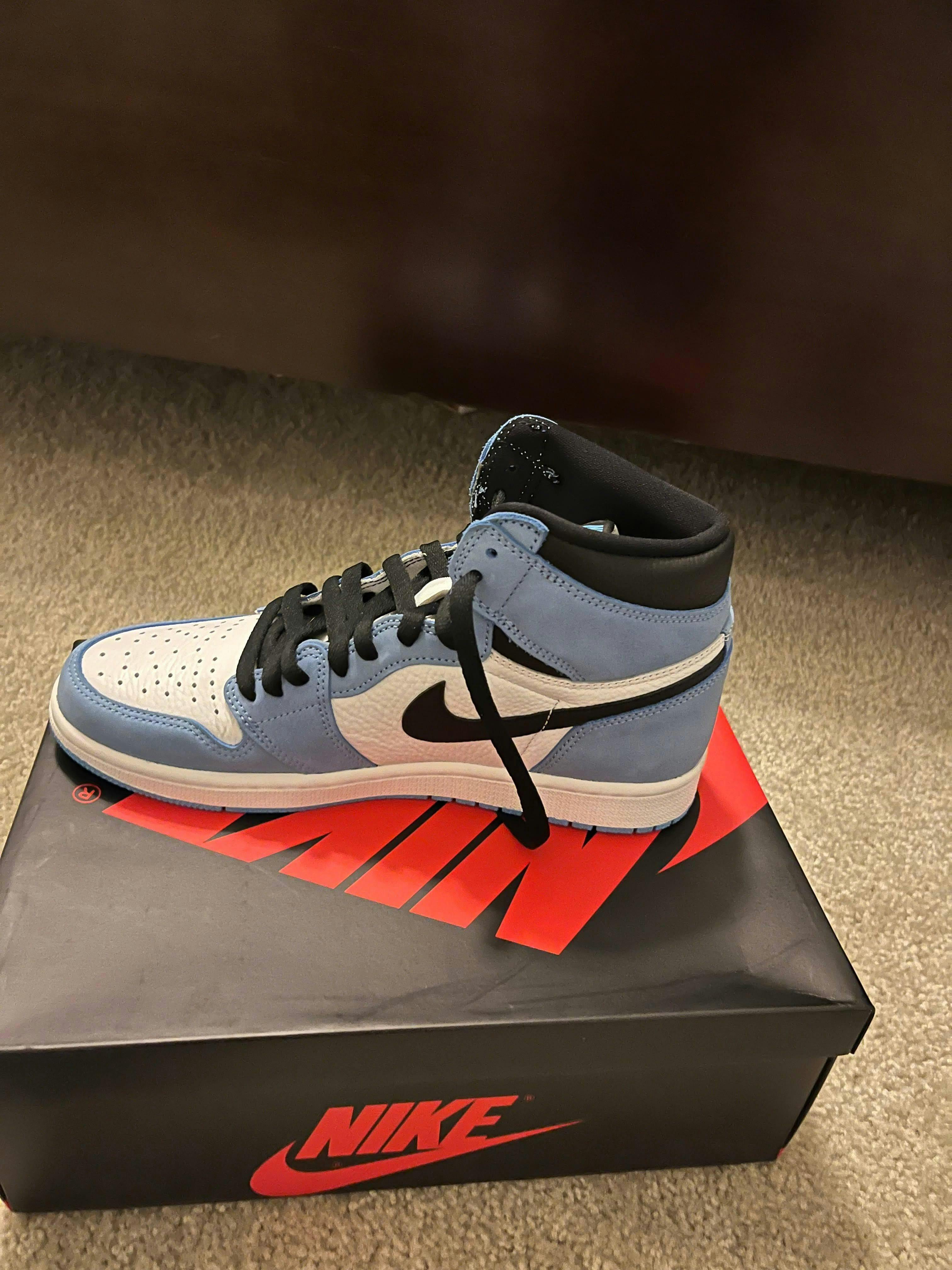 The Air Jordan 1 Retro High OG University Blue pays tribute to Michael Jordan’s legendary college career at the University of North Carolina. Featuring a crisp white leather base, the design is elevated with premium University Blue nubuck overlays and a contrasting black Swoosh, collar, tongue tag, and Wings logo. Classic Jordan 1 details remain intact, including a high-top silhouette, Nike Air tongue branding, and a supportive rubber cupsole with Air cushioning in the heel. Underfoot, a University Blue outsole provides reliable grip with its signature pivot point and multi-directional traction pattern.