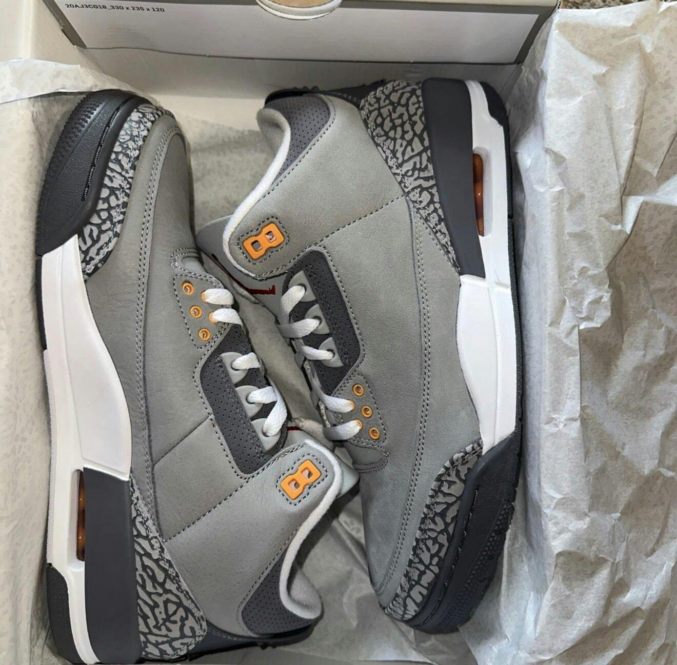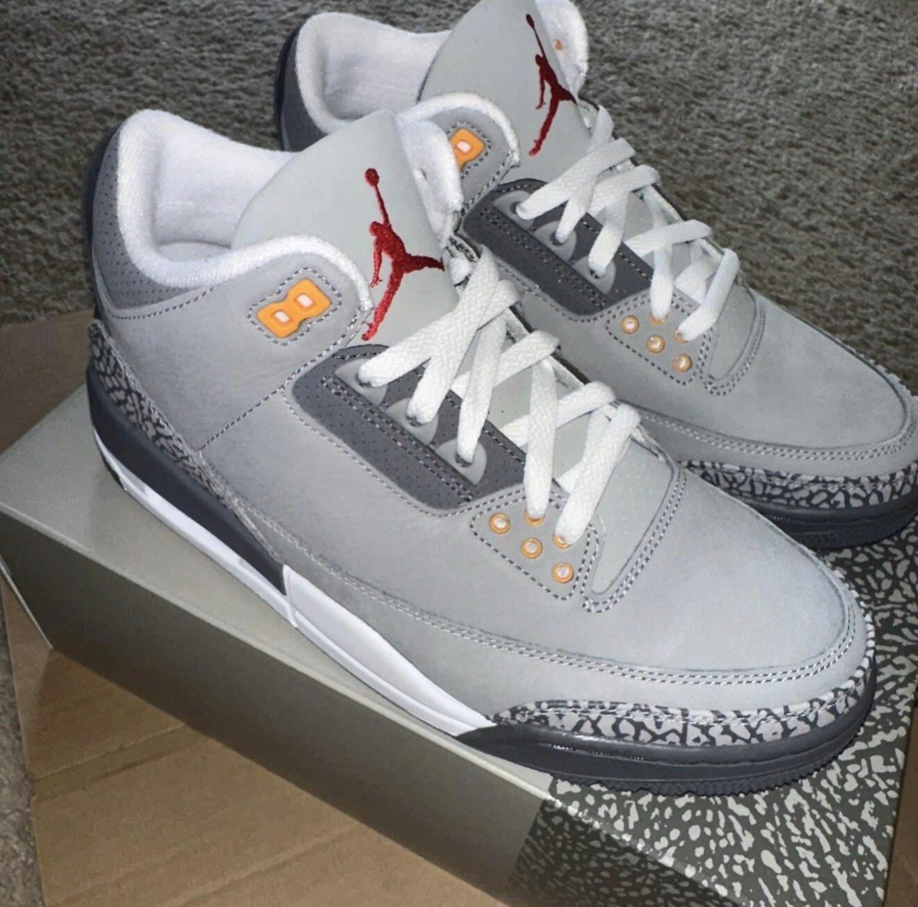 The 2021 edition of the Air Jordan 3 Retro Cool Grey marks the return of a colorway originally released in 2007. This reissue updates the classic design with premium materials, including a grey leather upper and signature elephant print overlays at the toe and heel. Color accents appear through an embroidered Jumpman logo in Sport Red on the tongue, while molded eyelets and heel branding incorporate Orange Peel tones. The midsole provides cushioning with a visible Air-Sole unit, and the rubber outsole supports traction and durability. Key Features Color: Cool Grey / Sport Red / Orange Peel Grey leather upper with elephant print overlays Embroidered Sport Red Jumpman on tongue Orange Peel eyelets and heel branding Visible Air-Sole unit in midsole Durable rubber outsole Reissue of the original 2007 colorway