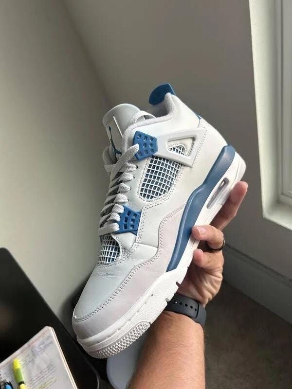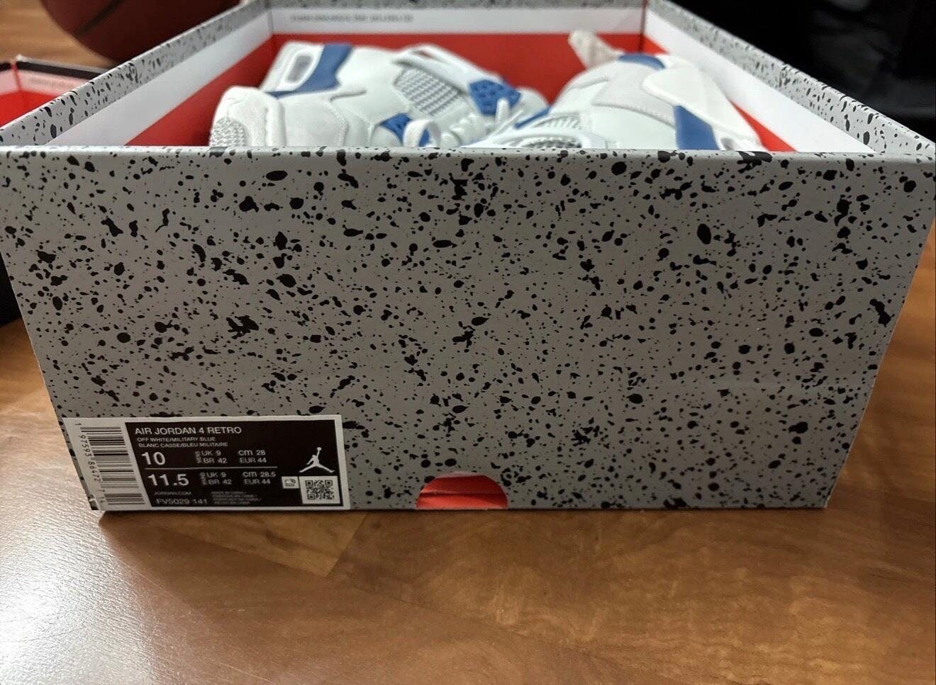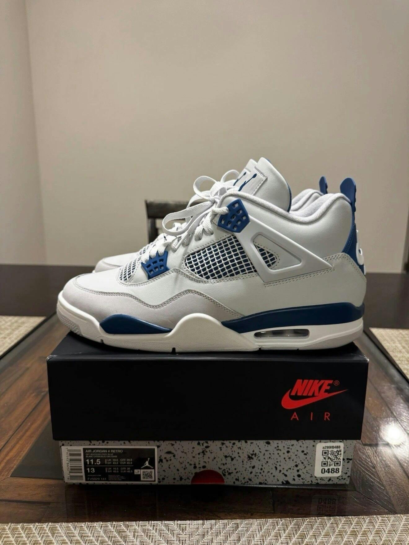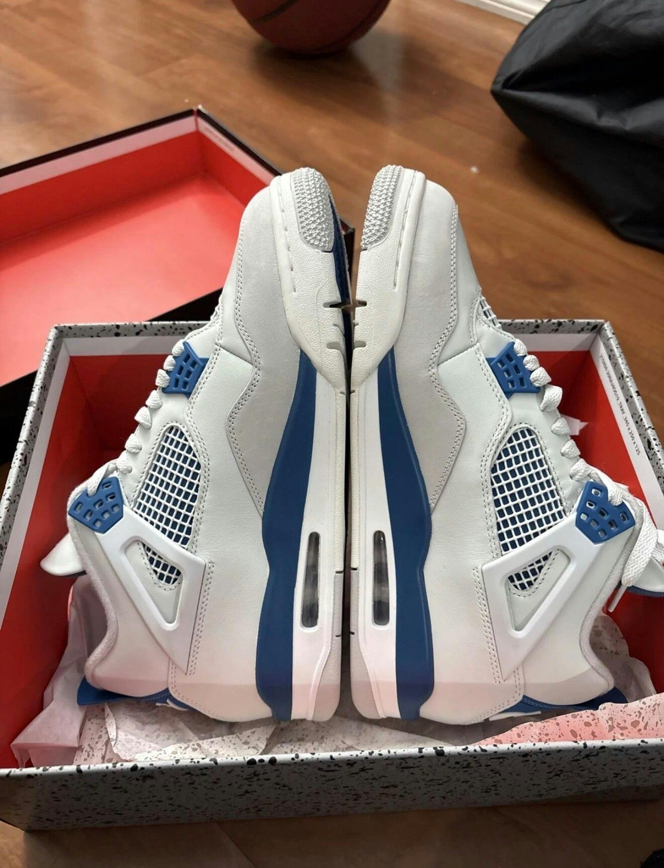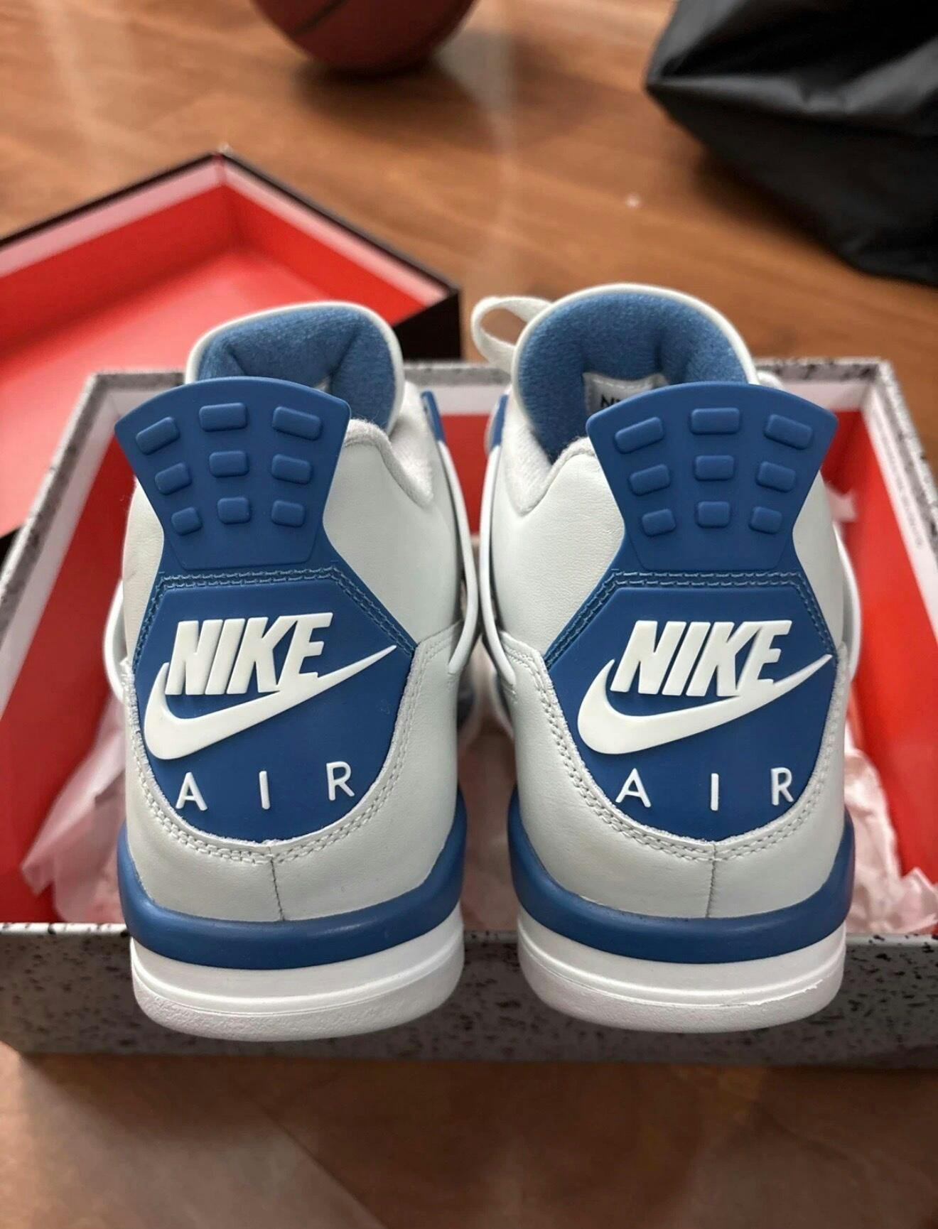 The 2024 release of the Air Jordan 4 Retro Military Blue, also called “Industrial Blue,” revives an original and highly sought-after colorway. This edition features a smooth off-white leather upper with breathable quarter-panel netting and a soft nubuck overlay at the forefoot. Military Blue accents highlight the molded eyelets, woven tongue tag with Jumpman logo, and the heel tab carrying classic Nike Air branding. Built for comfort and performance, the shoe includes a lightweight polyurethane midsole with an encapsulated Air-Sole unit in the forefoot and visible Air cushioning in the heel. A durable rubber outsole provides reliable traction, making this model suitable for both casual wear and sport