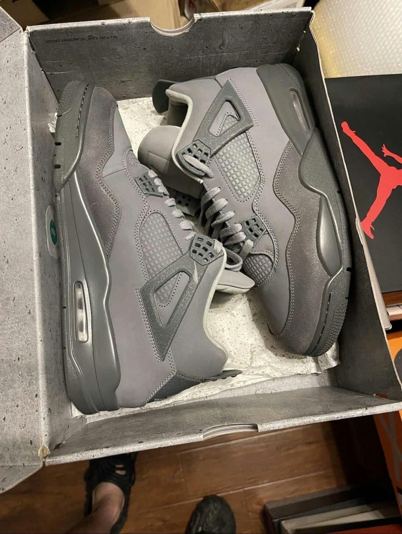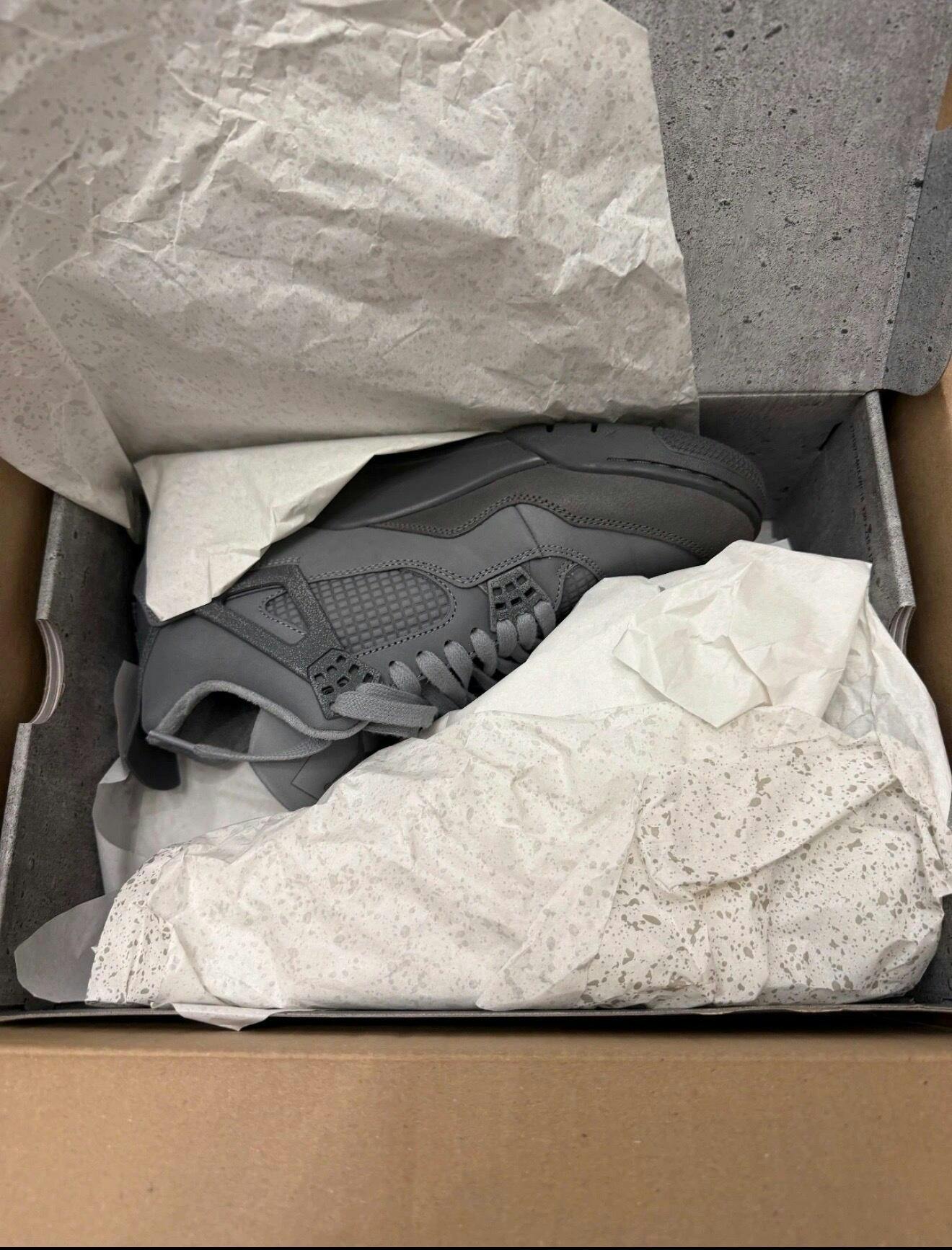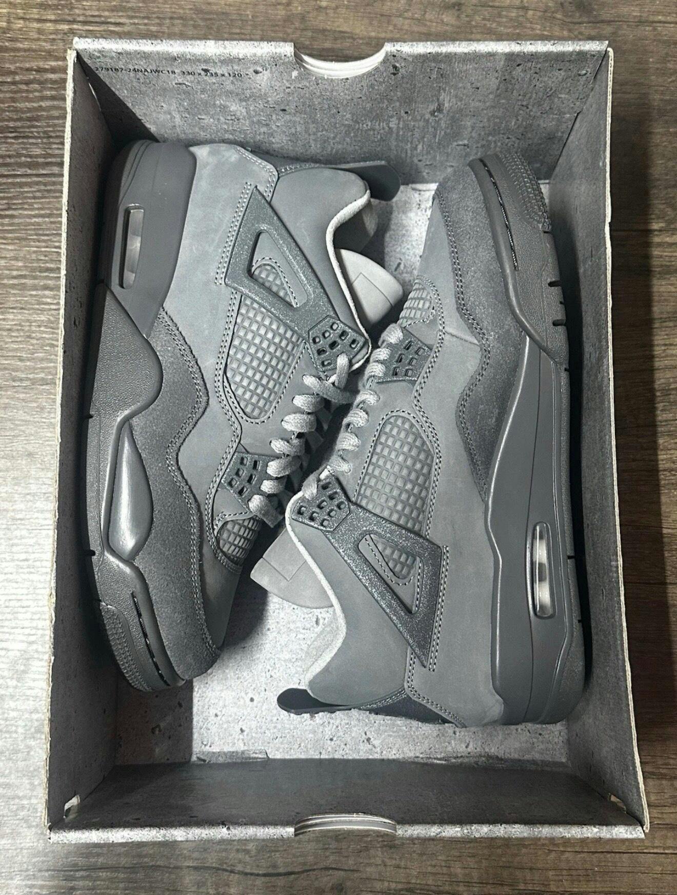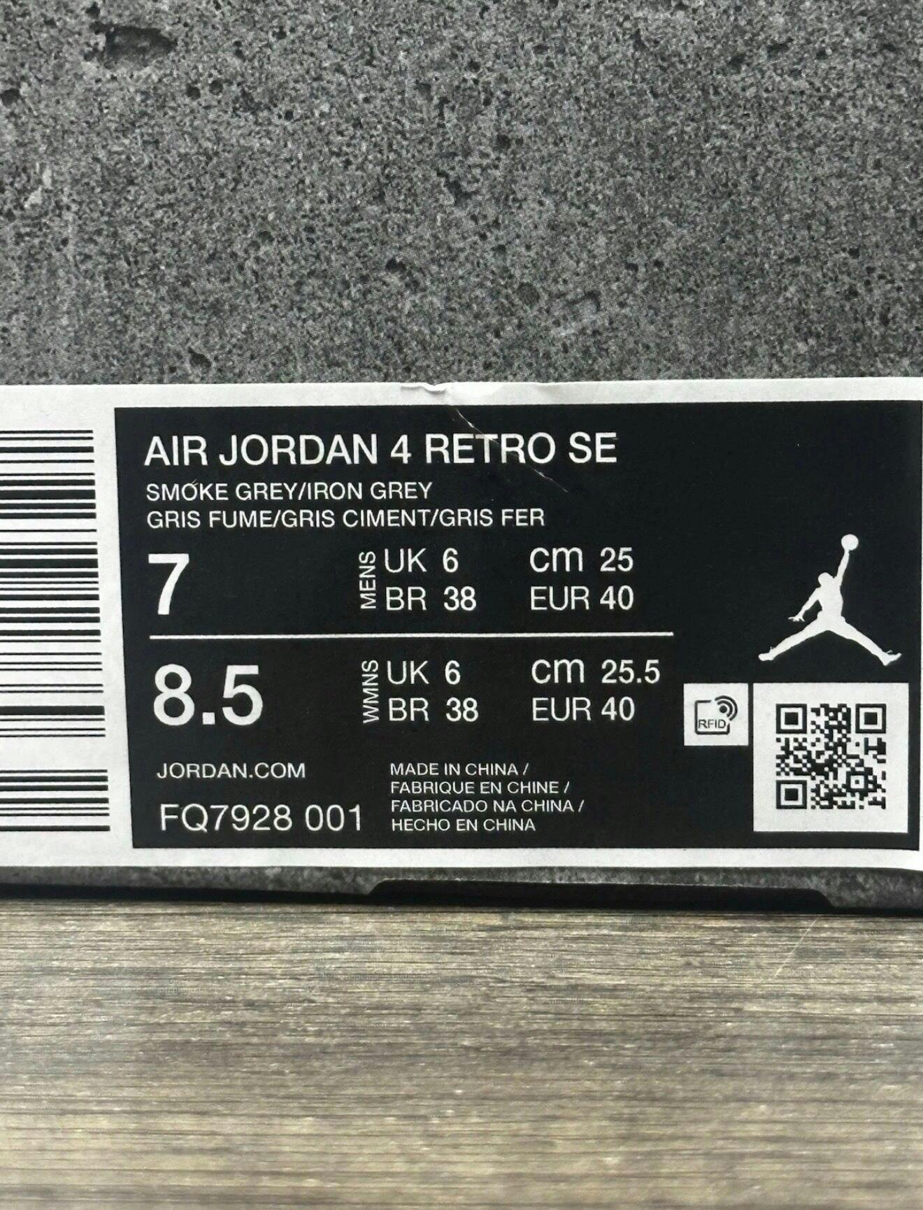 The Air Jordan 4 Retro SE Wet Cement, also referred to as the ‘Paris Olympics’, offers a refined take on the classic silhouette with a neutral, monochrome color palette in recognition of the 2024 Summer Olympics. The upper is constructed from various shades of grey nubuck, featuring a soft suede overlay at the forefoot and a debossed grid texture on the quarter panels. Speckled accents add contrast to the TPU support wings and molded back tab, which displays a raised Jumpman logo. A second Jumpman appears on the tongue. The sneaker is supported by a dark grey polyurethane midsole with visible Air-Sole cushioning in the heel for comfort and impact protection.
