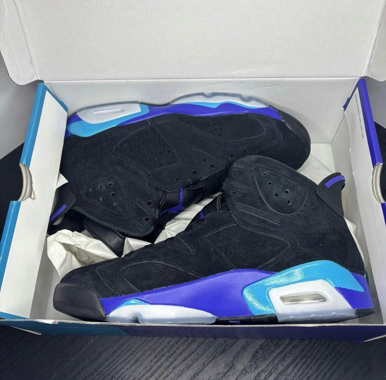 The Air Jordan 6 Retro Aqua draws inspiration from the original Aqua colorway of the Air Jordan 8, combining iconic design elements with bold accents. The upper is made of black nubuck and features signature details like lace locks, a molded tongue with dual grip openings, and a pull tab at the heel. Subtle Jumpman branding appears on the back, while contrasting shades of Bright Concord and Aquatone add color to the midsole. A visible Air-Sole unit in the heel offers lightweight cushioning, and a translucent rubber outsole ensures traction.