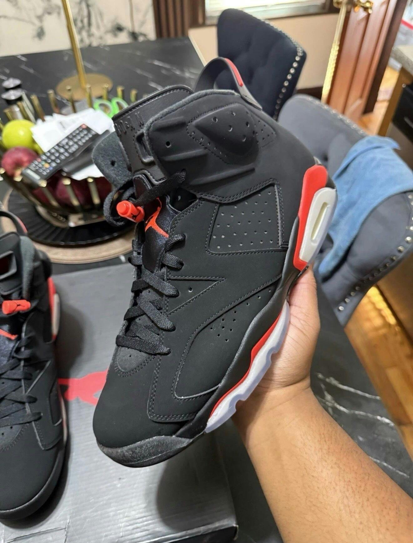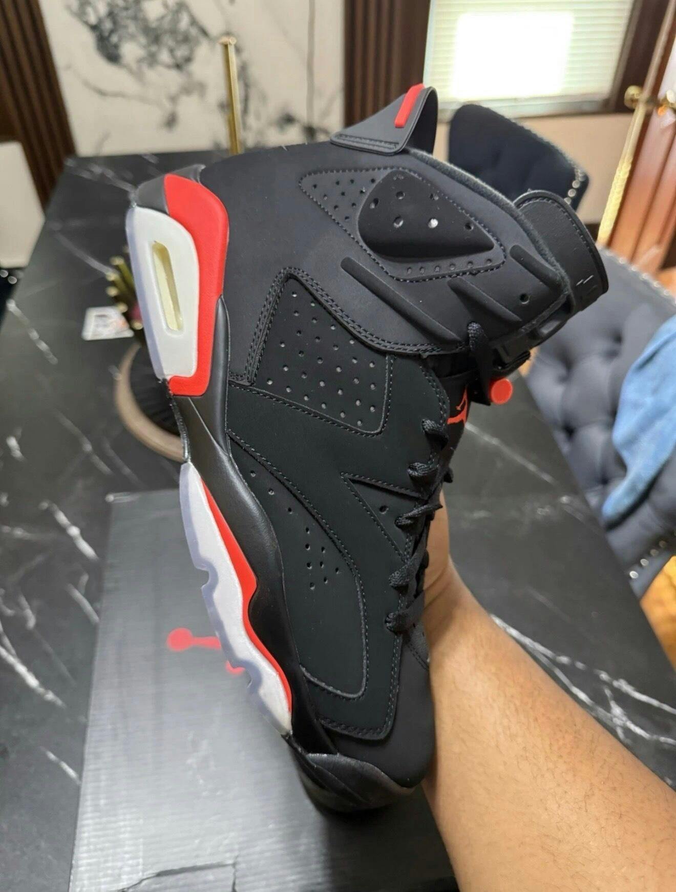 The 2019 release of the Air Jordan 6 Retro Infrared returns in a design faithful to the original colorway worn by Michael Jordan during his first NBA championship win. The upper is constructed from black nubuck and backed with a reflective 3M layer for added visibility. Infrared accents appear on the midsole, heel tab, and lace lock, offering contrast against the dark base. Nike Air branding is featured on the heel and sockliner—an original design element not seen since the 2000 edition. The shoe rests on a visible Air-Sole unit and translucent outsole for cushioning and traction.