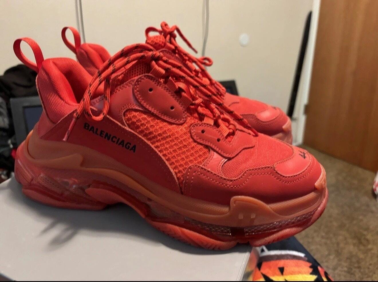 Balenciaga Triple S Sneaker Clear Sole Red. Luxury design with layered sole, bold red accents, and an iconic chunky silhouette for modern streetwear.The Balenciaga Triple S Clear Sole – Red’ brings a bold monochrome look to the brand’s signature chunky silhouette. The upper is built with layered mesh and leather in a striking red finish, paired with rope-style laces and embroidered sizing on the toe. Underfoot, a translucent stacked sole completes the design with the model’s distinctive oversized profile.