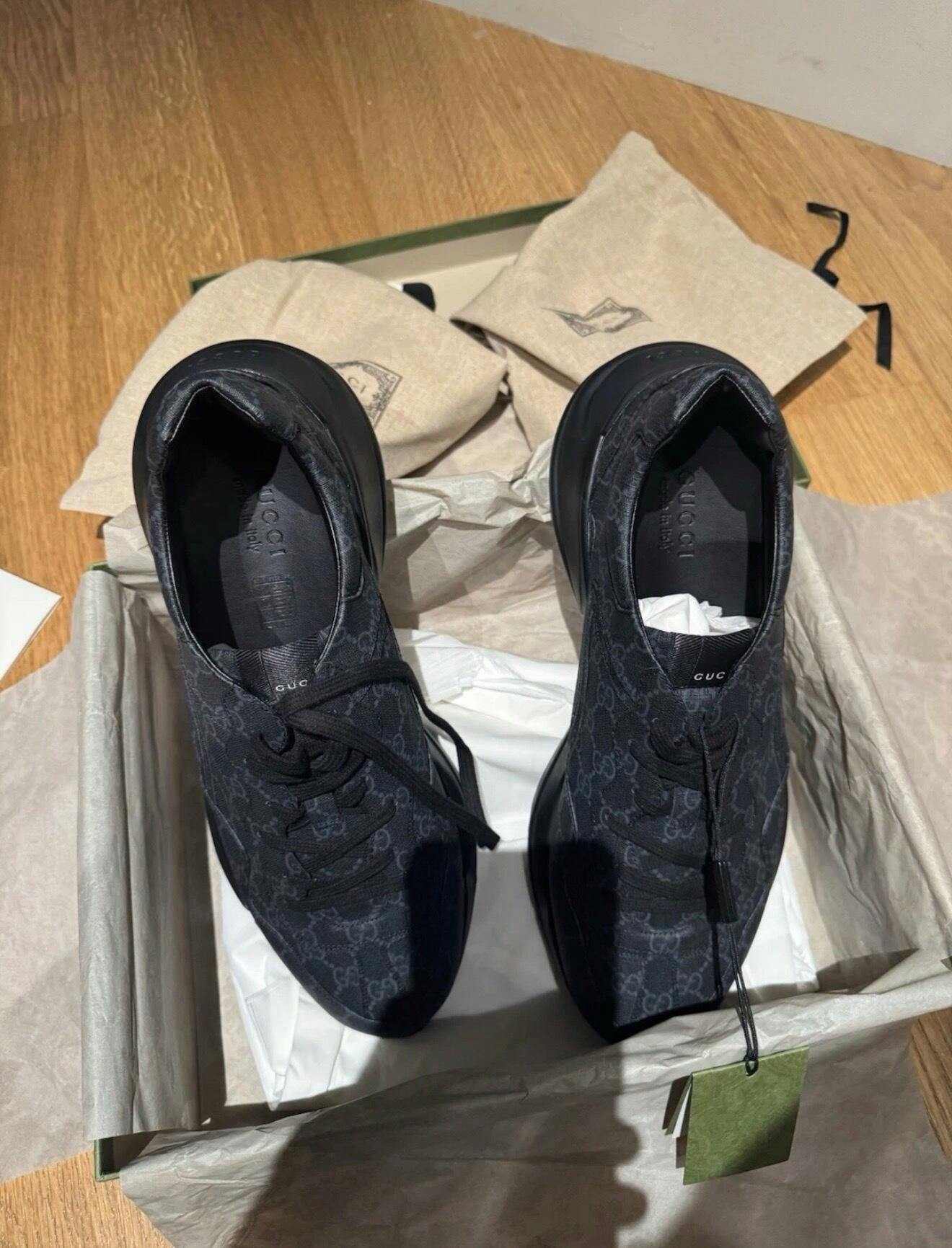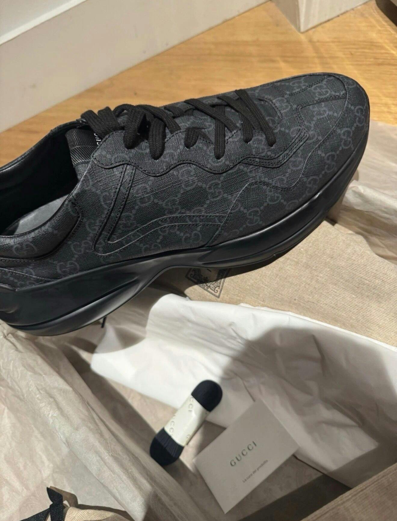 The Gucci GG Rhyton Black Monogram is a luxury lifestyle sneaker released on May 6, 2022. Designed with a premium black canvas upper, this model showcases Gucci’s iconic GG monogram pattern across the shoe for a bold, statement look. Set on a chunky rubber sole, the Rhyton blends fashion-forward design with everyday wearability. Subtle detailing and a low-top silhouette highlight Gucci’s signature craftsmanship, making it a standout piece in both streetwear and high-fashion rotations.