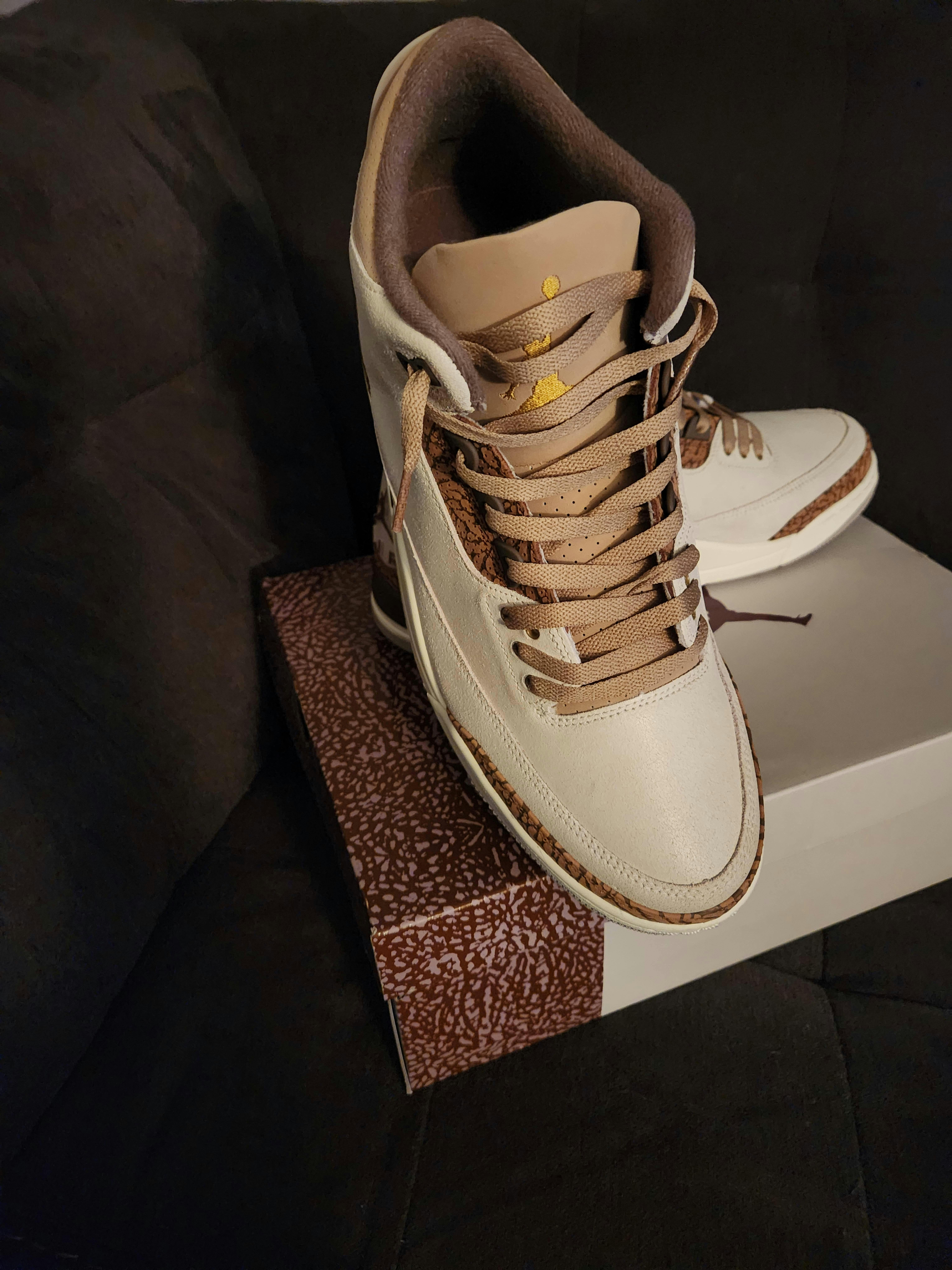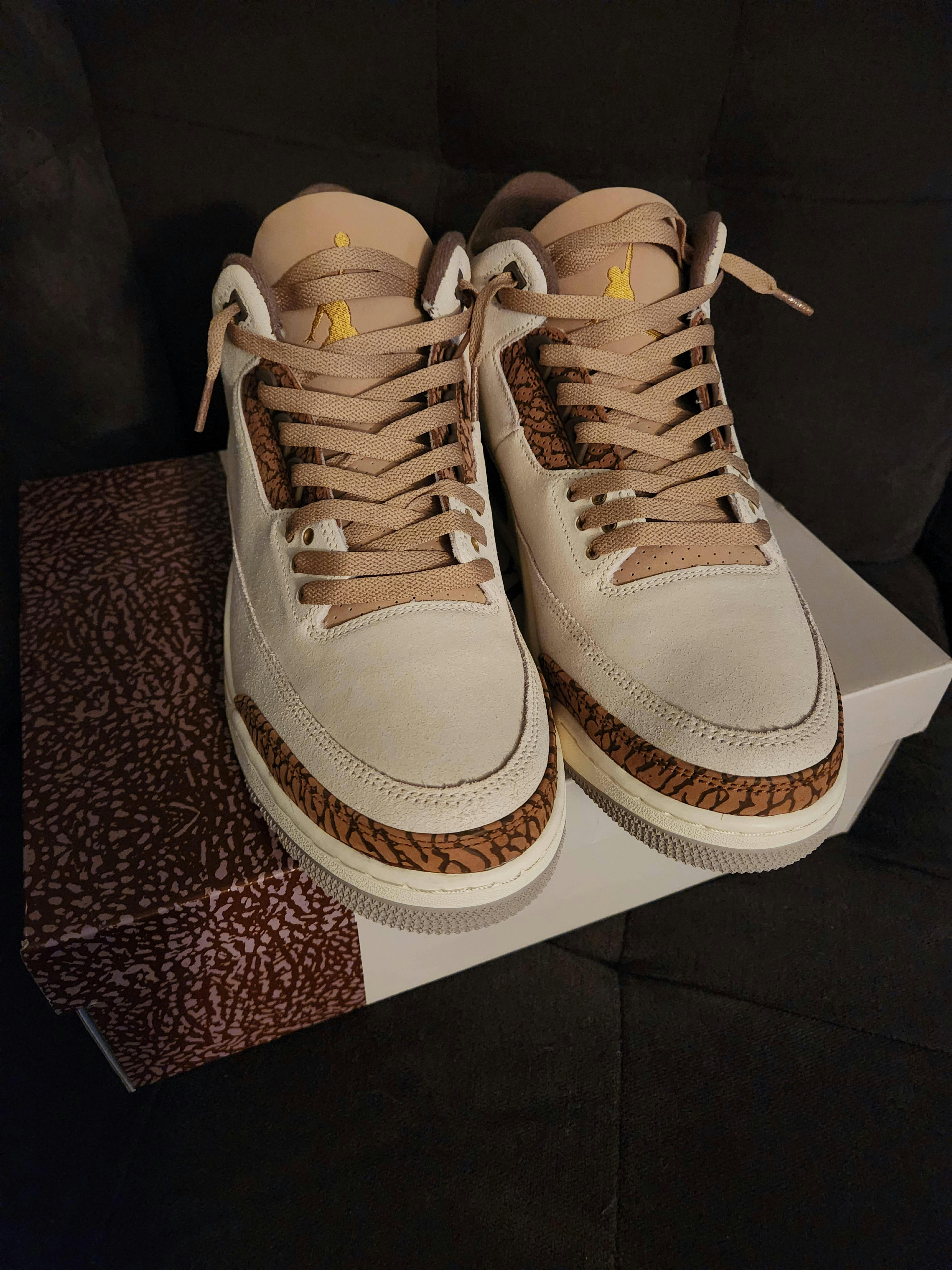 The Air Jordan 3 Retro Palomino brings a fresh, earthy tone to a classic silhouette. This version features an upper made of off-white suede, accented by brown elephant-print overlays at the toe and heel. Matching brown detailing also appears on the eyestay, creating a cohesive and textured look. A tan perforated nubuck collar adds contrast and comfort, while classic Jumpman logos appear on both the tongue and molded heel tab. Underfoot, a cream-toned polyurethane midsole houses a visible Air-Sole unit in the heel for lightweight cushioning, supported by a grey rubber outsole for traction and durability. Key Features Color: Off-White / Palomino / Light Brown / Grey Suede upper with elephant-print overlays Perforated nubuck collar Jumpman logos on tongue and heel Vintage-style midsole with visible Air-Sole unit Durable grey rubber outsole