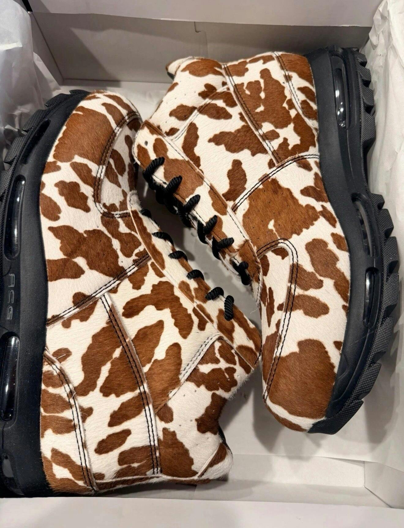 The Pony Hair Pack “Cow Print” Boot (2025) delivers a bold, fashion-forward take on classic boot styling. Featuring a multi-color upper in Sail, Cacao Wow, Black, and brown tones, the design is accented with a textured pony hair overlay for a standout cow print aesthetic.