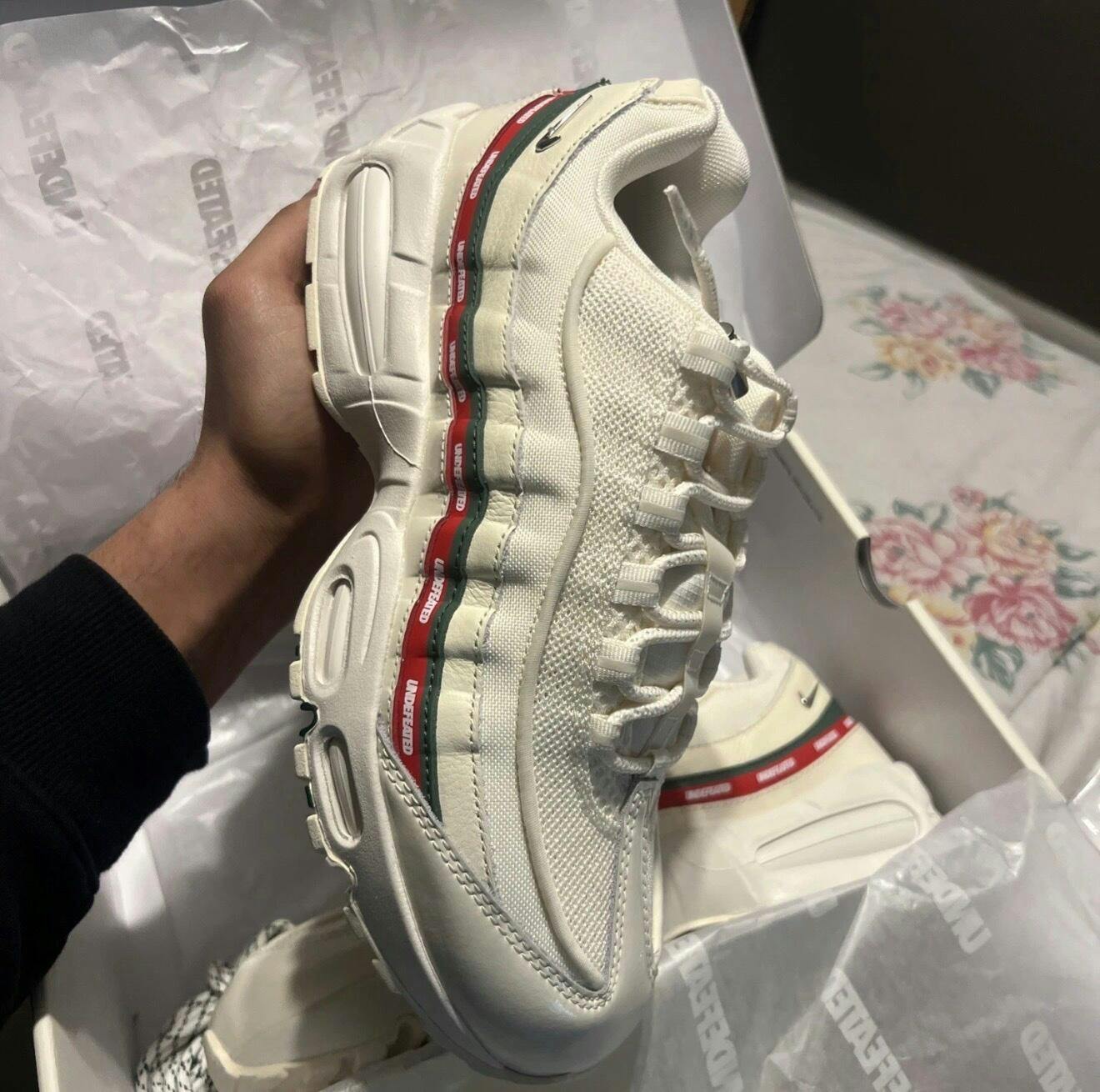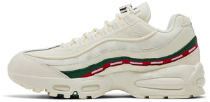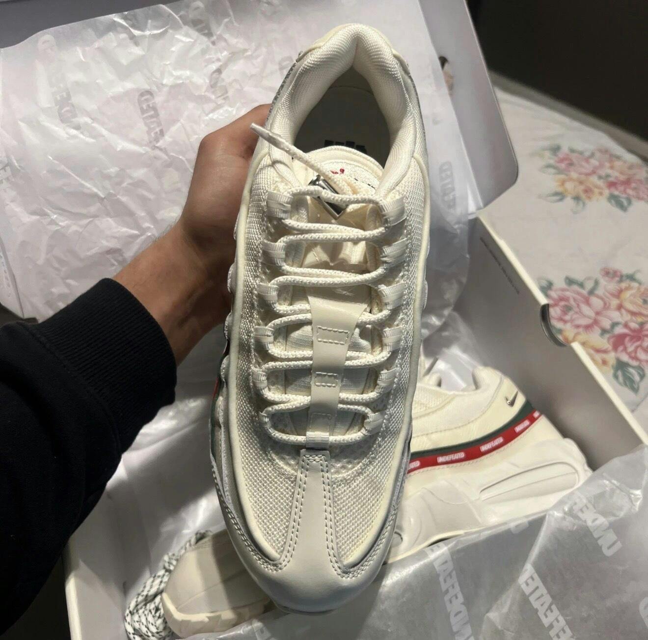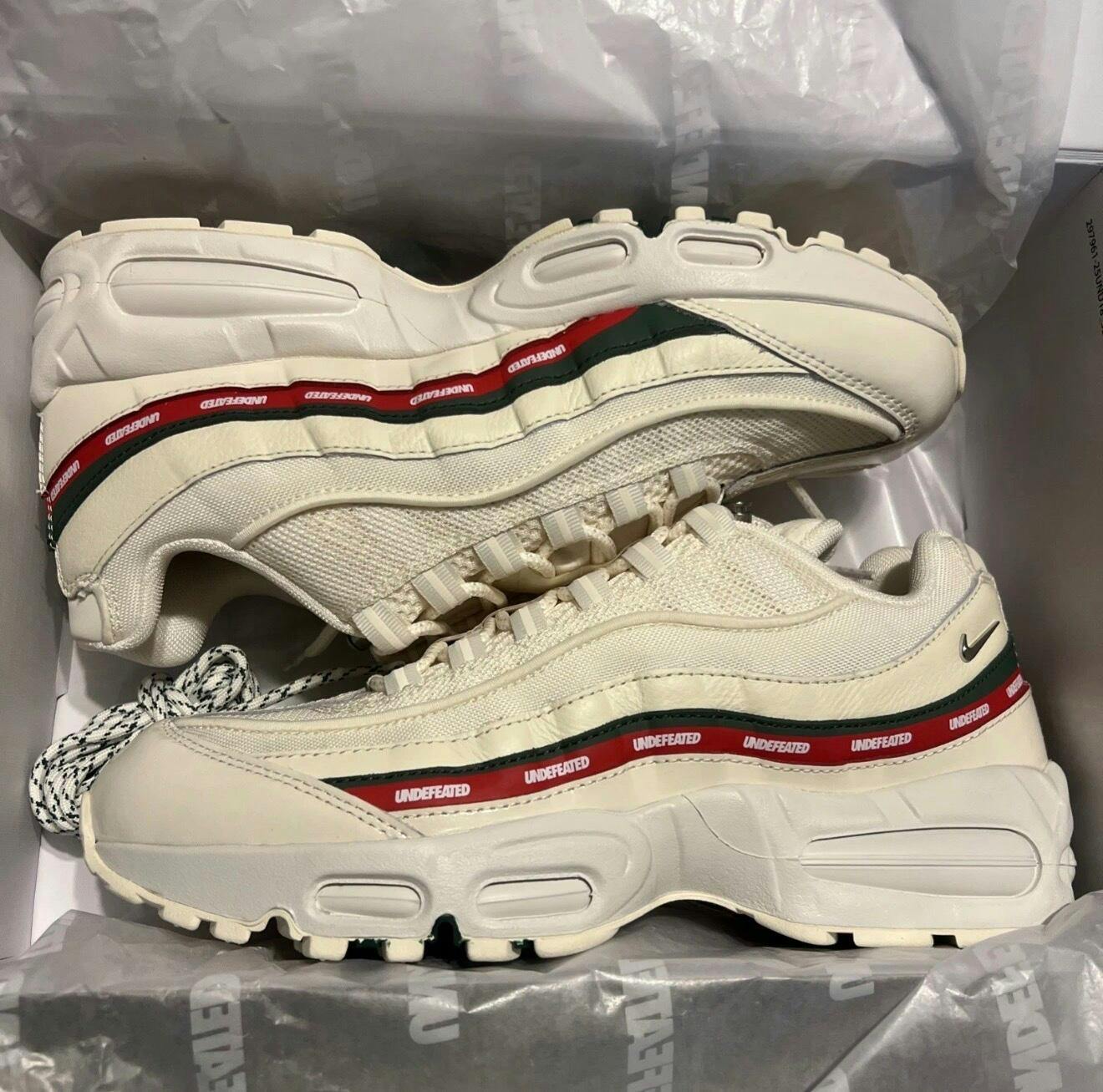 The Undefeated x Nike Air Max 95 “Sail” combines classic running heritage with subtle streetwear detailing. Featuring a refined off-white mesh and leather upper, the sneaker highlights the Air Max 95’s signature wavy side panels, accented with racing stripes in green and red patterned with the Undefeated wordmark.