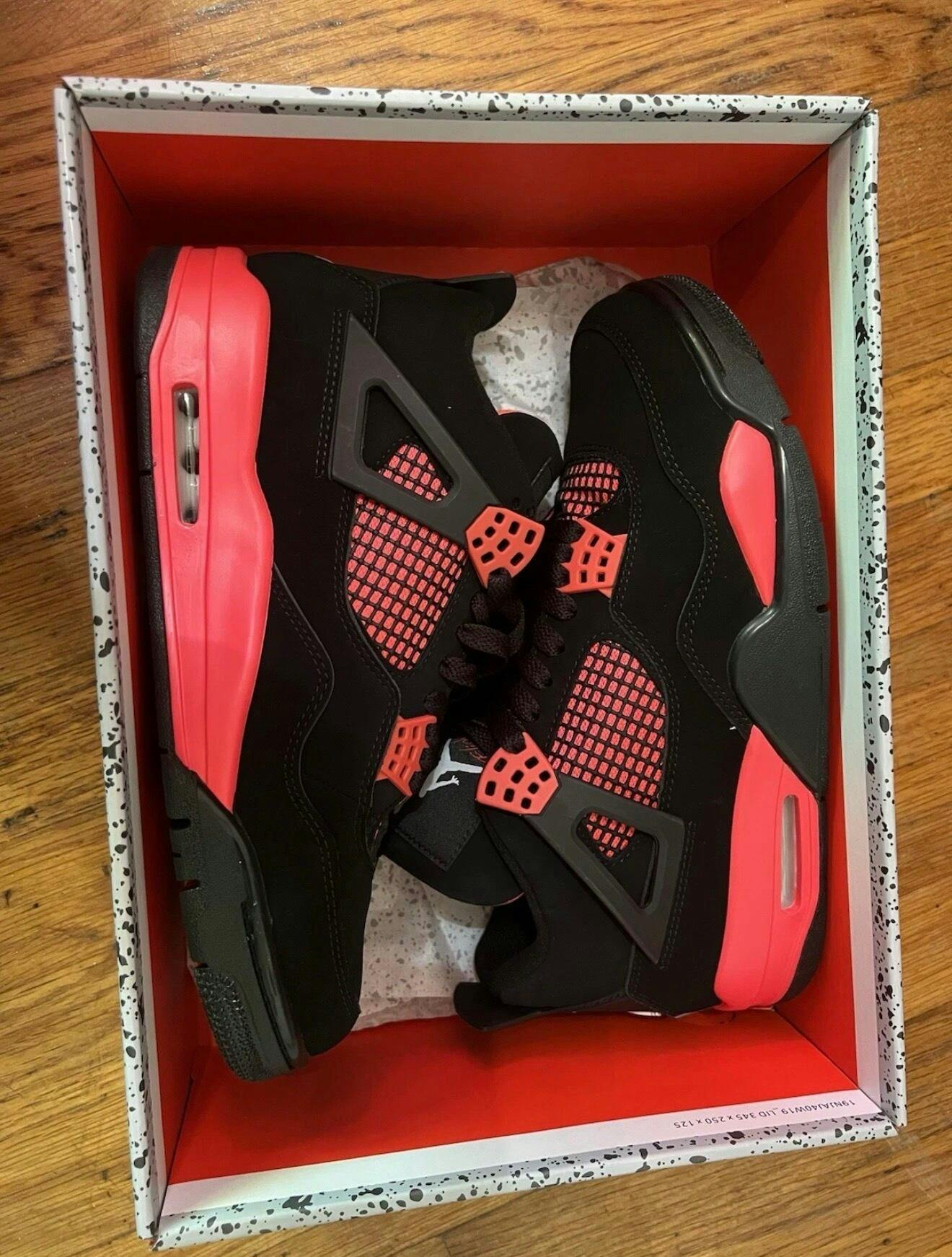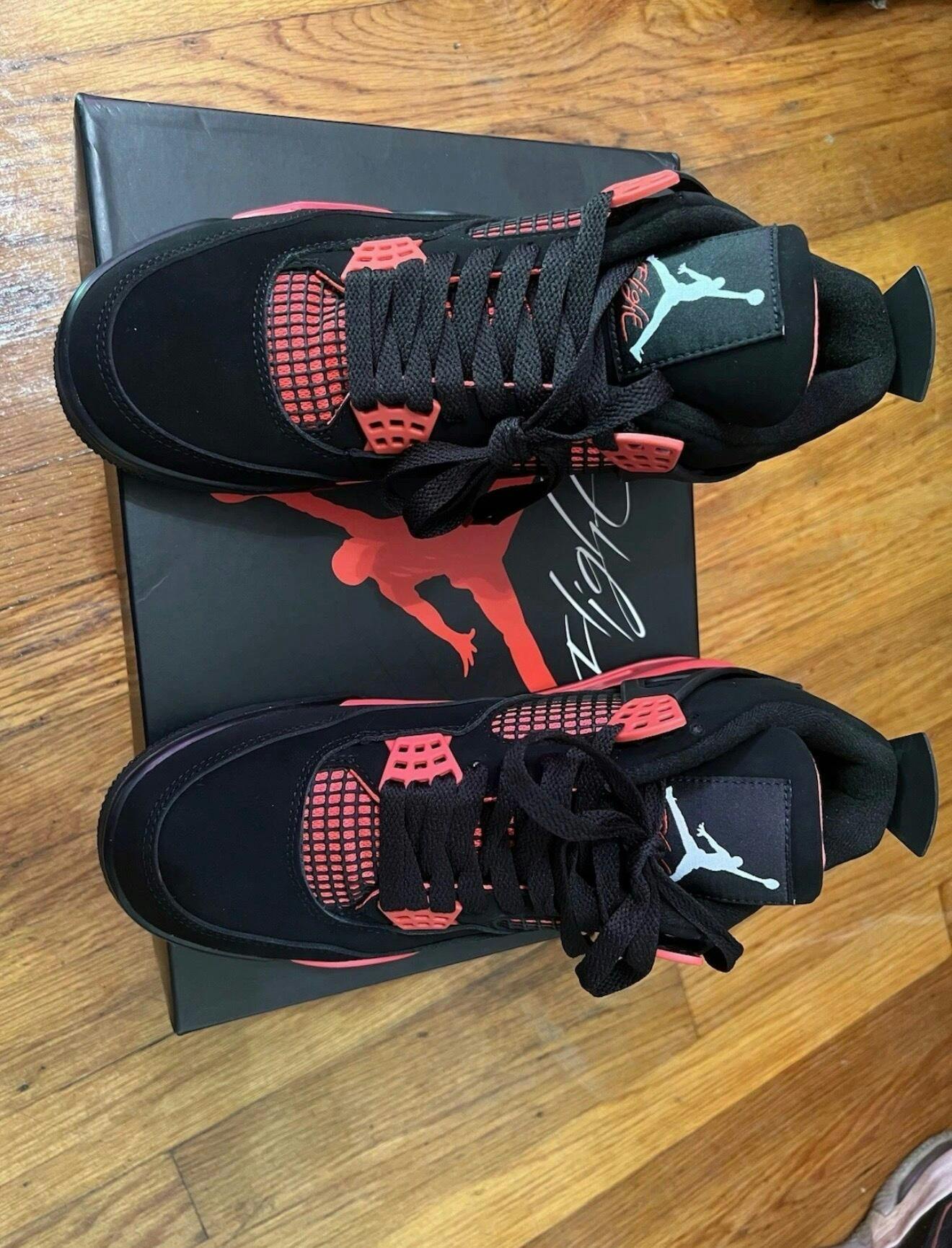 The Women’s Air Jordan 4 Retro Red Thunder offers a bold update to a classic basketball silhouette. Featuring a black nubuck upper, this mid-top sneaker includes striking crimson accents throughout the eyelets, tongue lining, quarter panels, and midsole. Signature design elements such as visible Air cushioning in the heel and mesh side panels remain intact. A Jumpman logo appears on both the tongue and heel, staying true to the iconic Jordan Brand look.