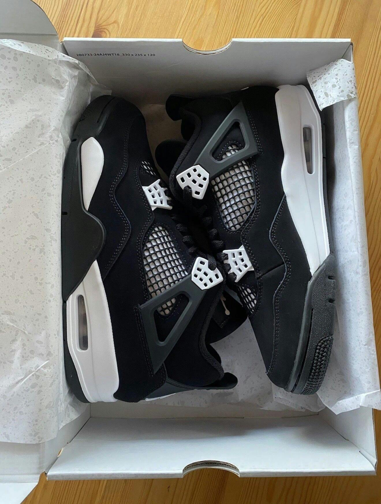 The Women’s Air Jordan 4 Retro White Thunder features a black suede upper with white accents that highlight the molded eyelets and the mesh quarter panel. The mesh sections are layered with black netting, offering a subtle texture contrast. Additional design elements include white Jumpman logos on the tongue tag and heel panel. The midsole is constructed from white polyurethane and includes a visible Air-sole unit in the heel for cushioning. Underfoot, a black rubber outsole with a herringbone pattern provides grip and support.